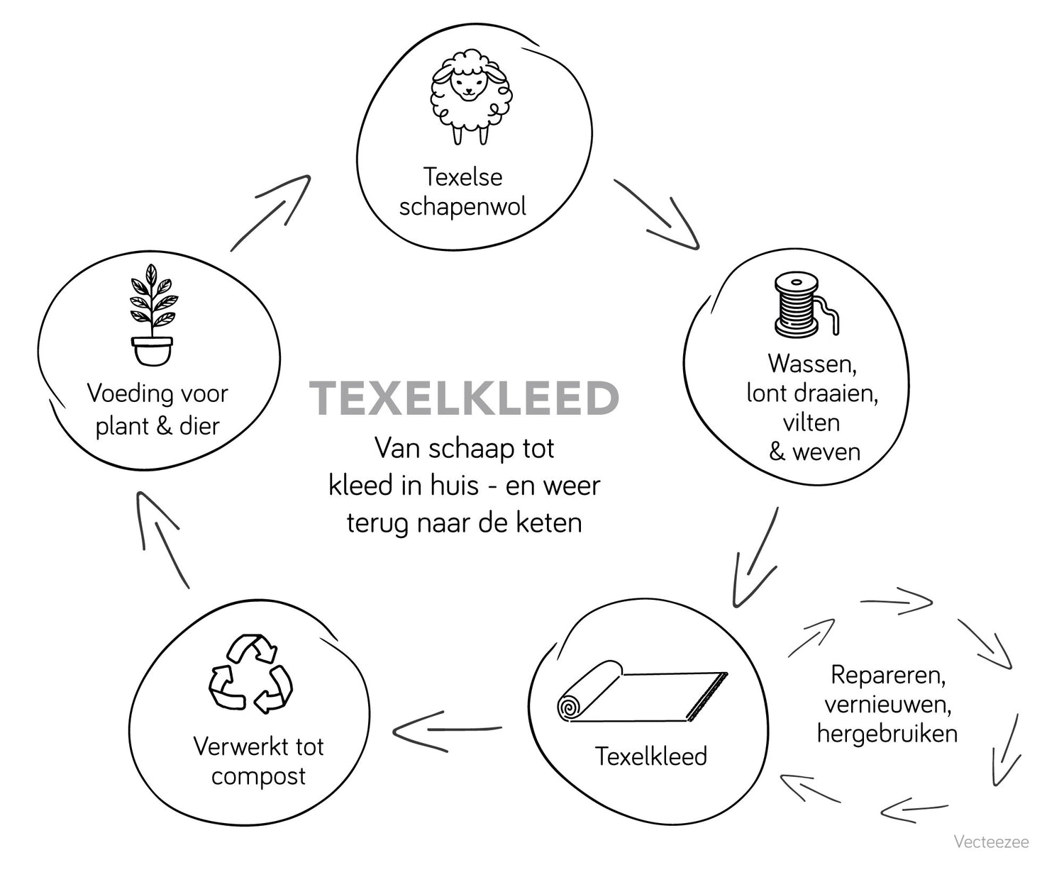 Texelkleed brengt de historische kringloop terug: mens zorgt voor schaap, schaap geeft wol, wol wordt kleed. Elk jaar groeit een nieuwe vacht - wol is hernieuwbare grondstof. Geen aardolie, geen microplastics, wel bewuste keuzes.